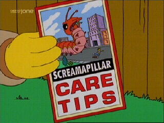 The Simpsons were forced to take care of the Screamapillar by the Environmental Protection Agency. The EPA Scientist told them that because the Screamapillar had chosen to live in their yard, they were responsible for its well-being. He gave them a booklet which explained how to care for the Screamapillar.