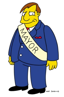 The current mayor of Springfield is Joe Quimby, a sleazy womanizing politician whose served at least five consecutive terms as mayor unopposed, he once admitted to using the town treasury to fund the murder of his enemies. He was briefly thrown out in favor of Sideshow Bob but was later reinstated when Bob was impeached and arrested for electoral fraud. His post was threatened by a recall election, but none of the new candidates gained enough of the vote to oust him since the lead candidate who was most voted for was disqualified from the election. It was revealed that he is re-elected so often because his opponent has a long, unpronouncible Slavic Name.
