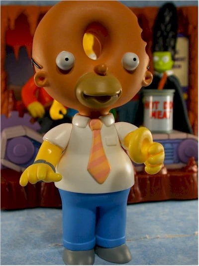 However, not long after, McFarlane Toys-known for their sports line of action figures- decided to revive Simpsons collecting and start a new line of figures. The first set to be released was the "Ironic Punishment" set, from the episode, Treehouse of Horror IV. It features Homer being "tortured" by one of the devils minions, by forcing all the donuts in the world down his throat. It was soon followed by a "Family Couch Gag" set, from the beginning of each episode. So far, the new line has been accepted very well by Simpsons collectors and plans for an official line of figures will be soon.